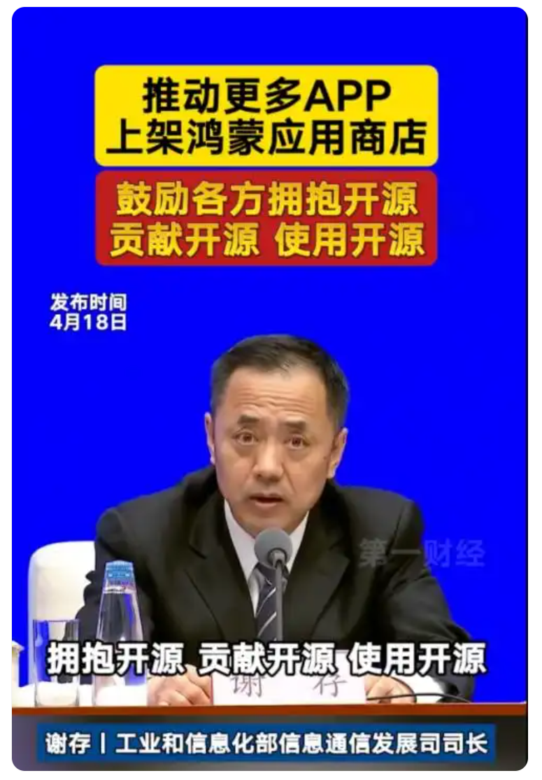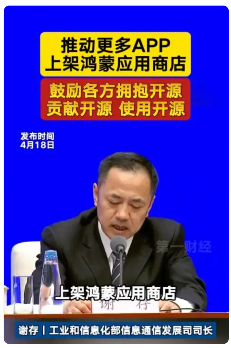2025年4月18日,工信部信息通信发展司司长谢存明确强调推动更多APP上架鸿蒙应用商店的重要性,将通过推动应用上架、支持开源共建、加速场景融合三大举措,构建中国数字经济的底层基础设施。