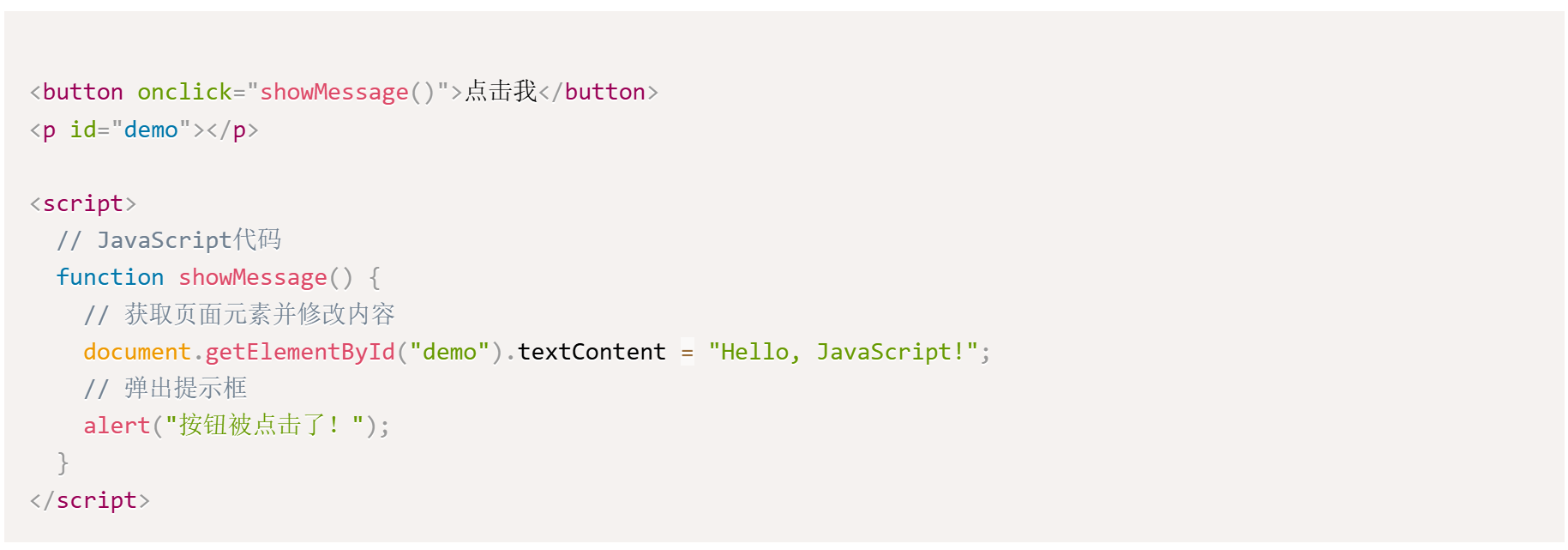 这段代码中,JS 通过onclick事件监听按钮点击,触发showMessage函数,动态修改页面内容并弹出提示,体现了其交互能力。