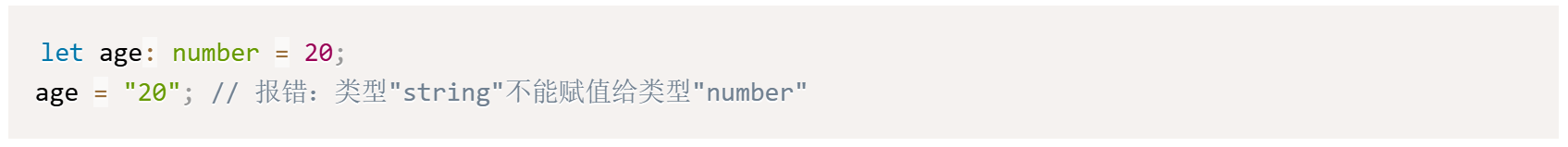 - 例如,不能把字符串赋值给数字类型的变量,TS 会直接提示错误: