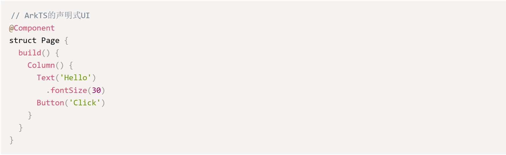 原生支持声明式 UI,通过@Component、build()等语法直接描述 UI(如Column()、Text()组件)。 |