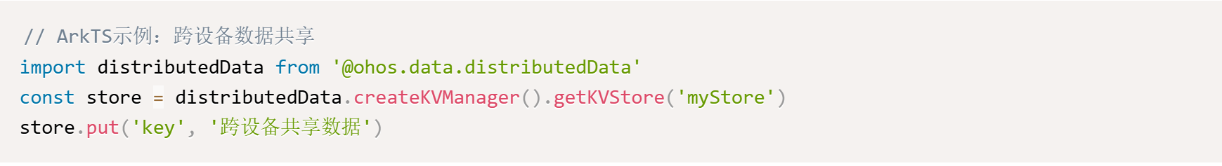 ArkTS 原生支持鸿蒙的分布式软总线、跨设备数据同步等特性,例如通过简单 API 实现多设备协同: