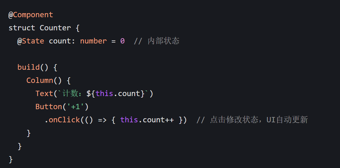 - 状态变量:直接在组件内声明,修改时 UI 会自动刷新。
